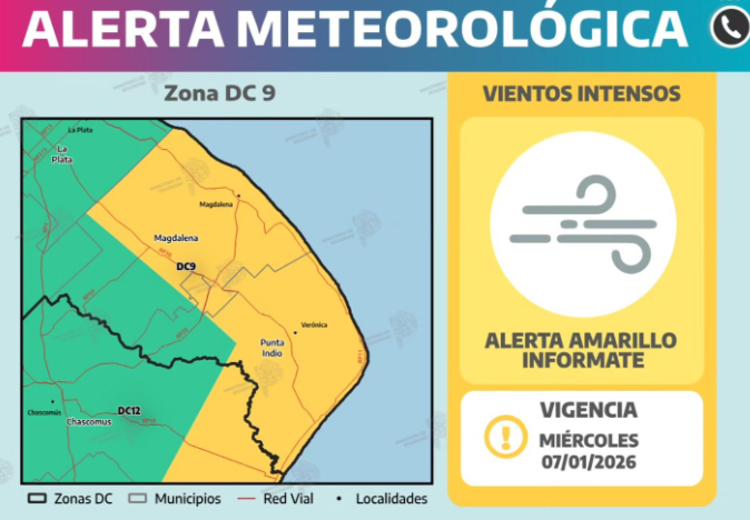Durante la tarde y la noche del día de hoy 7/1, se espera que los municipios en amarillo sean afectados por vientos del sector sur con velocidades de entre 40 y 55km/h y ráfagas que podrían alcanzar los 70 km/h, que pueden ser superados de manera puntual.