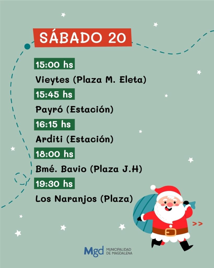 Este sábado inicia su recorrido en Vieytes y, a lo largo de los próximos días, irá visitando distintas localidades para compartir sonrisas, encuentros y ese espíritu navideño que nos invita a volver a encontrarnos como comunidad. El lunes, la recorrida culminará en la ciudad de Magdalena.
