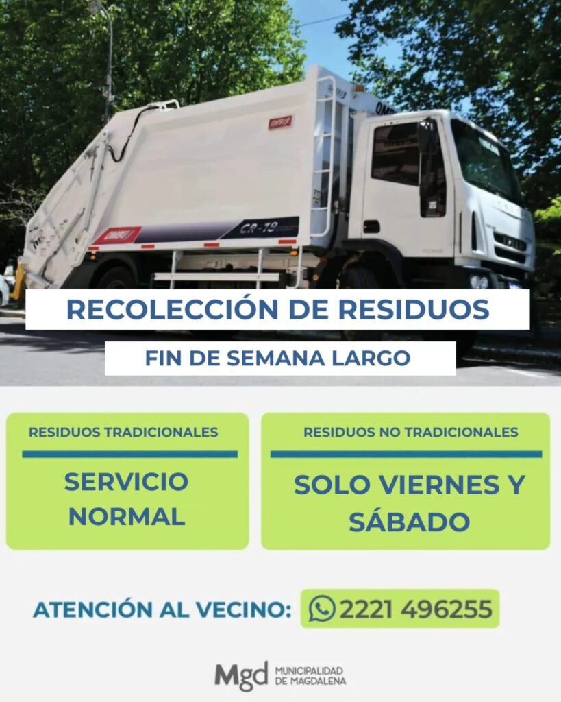 La Dirección de Servicios Públicas informa que, durante este fin de semana largo, el servicio de recolección funcionará de la siguiente manera: