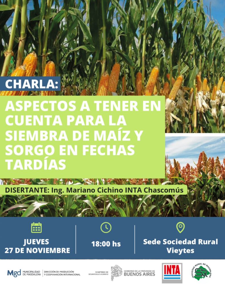 Si sos productor agropecuario, te invitamos a participar de la charla “Aspectos a tener en cuenta para la siembra de maíz y sorgo en fechas tardías”, dictada por el Ing. Mariano Cichino de INTA Chascomús.
